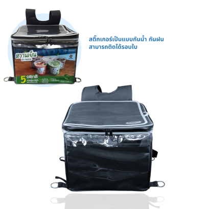 ขนาดใหญ่ถึง89 ลิตร เป็นกระเป๋าส่งอาหาร/ เครื่องดื่ม/ ชาบู / หมูกระทะ เเข็งเเรงทนทาน ติดตั้งง่าย ไม่ต้องใช้ตะแกรง มีหูจับ 2 ด้าน (เหมาะสำหรับยกกระเป๋าได้ง่ายยิ่งขึ้น) มีซิปกันน้ำและมีถุงซับด้านในถอดออกได้เพื่อการทำความสะอาดที่ง่าย สินค้าได้รับการจดสิทธิบัตร สามารถติดโลโก้บริษัทรอบกระเป๋าได้ (ติดฟรี1ด้าน) รองรับน้ำหนักได้มากถึง 40-45 กิโลกรัม