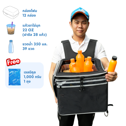 ขนาด 34 ลิตร เก็บความเย็น 13.5°C ใน 20 ชม. ฟรี เจล 1,000g. 1 ถุง รองรับน้ำหนัก 15-25 กิโลกรัม ใหม่!!มีช่องเปิดฝา ด้านบนโชว์ สินค้าได้ดี เหมาะสำหรับยืนขาย น้ำผลไม้ แซนวิช ซูชิ หยิบสะดวกไม่ต้องเปิดซิป หิ้วสบาย ไม่ปวดไหล่ ด้วย สาย “Support” หนานุ่ม ถึง 2 เส้น ด้านหน้ามีช่อง “ใส่โลโก้เองได้”สะพายได้ทั้งด้านหลัง/ด้านหน้า/รัดติดรถมอเตอร์ไซค์ได้ น้ำไม่รั่วซึม
