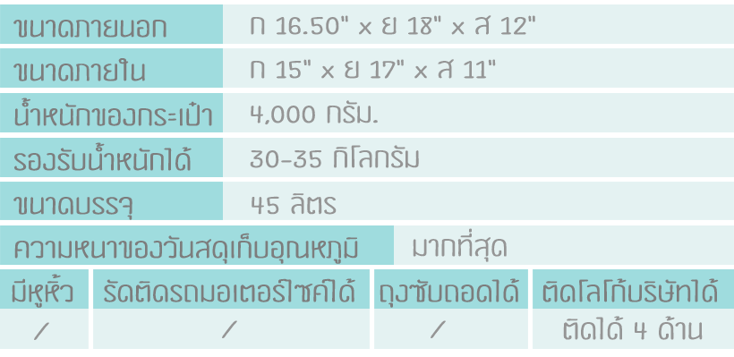 เก็บความเย็นได้นาน 4-6 ชม.( เมื่อใช้ร่วมกับน้ำแข็งเทียม) ความร้อน 2-4 ชม