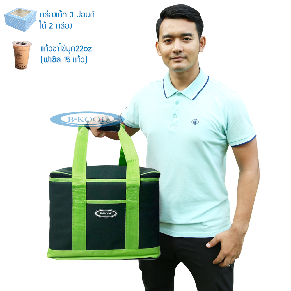 ขนาด 22 ลิตร เก็บความเย็น 14.5°C ใน 10 ชม. ฟรี เจล 1,000g. 1 ถุง รองรับน้ำหนัก 15-20 กิโลกรัม ใช้เป็นกระเป๋าส่งเค้กระหว่างการจัดส่ง บรรจุกล่องเค้กขนาด 3 ปอนด์ ได้2 กล่อง /อาหาร/เครื่องดื่ม หิ้วได้