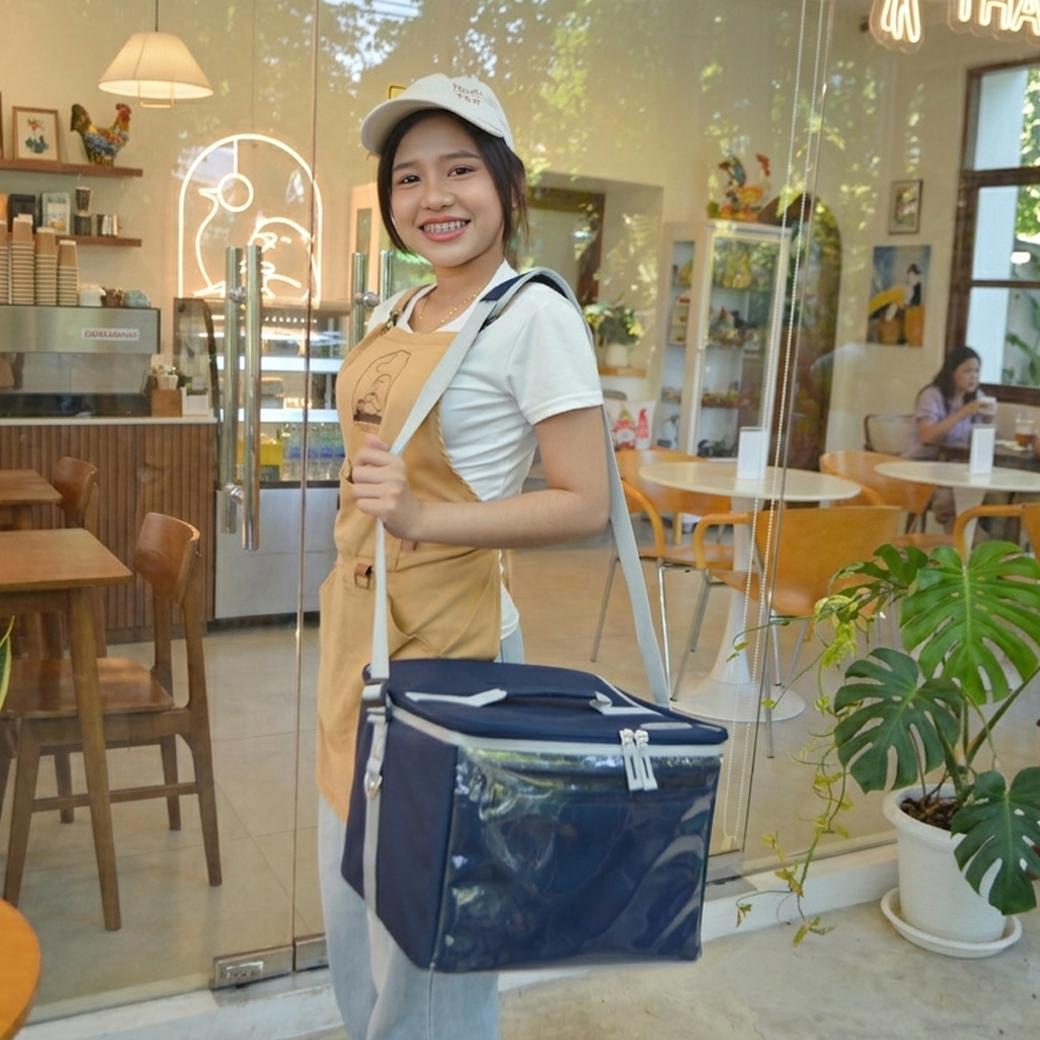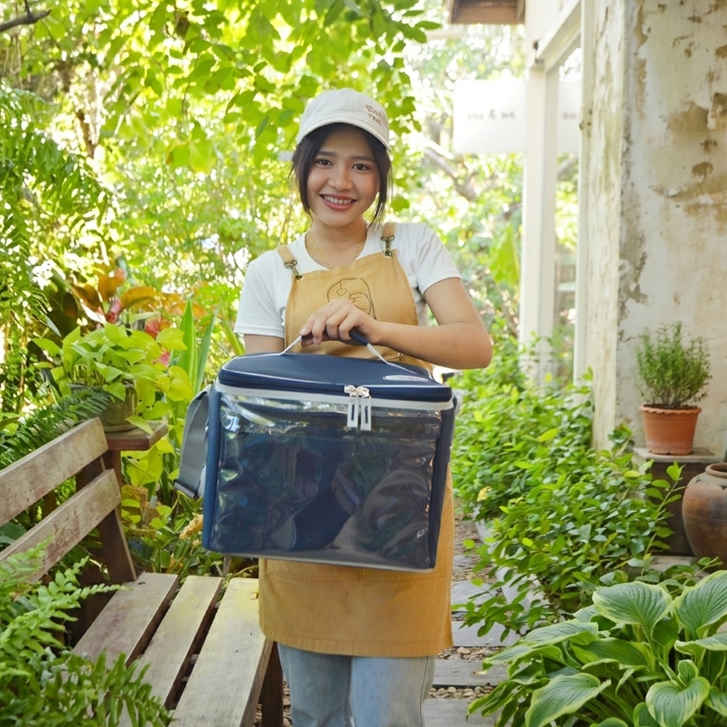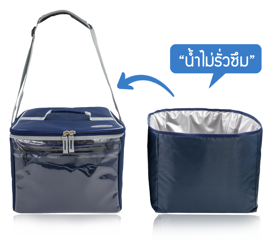 ขนาด 25 ลิตร เก็บความเย็น 4.5°C นาน 24 ชม.ฟรี เจล 1,000g.2 ถุง รองรับน้ำหนัก 15-20 กิโลกรัม ใหม่!! เหมาะสำหรับใส่เค้ก 2 ปอนด์ ได้ 2 กล่อง/น้ำผลไม้/แซนวิช/ซูชิ ด้านหน้ามีช่อง “ใส่โลโก้เองได้”สายปรับระดับได้ พร้อม แผ่นรองรับที่บ่าไม่ให้เมื่อยเวลาบรรจุของหนัก หิ้ว/สะพายข้าง/คล้องคอ/รัดติดรถมอเตอร์ไซค์ได้ มีถุงด้านในถอดออกได้เพื่อการทำความสะอาดที่ง่าย น้ำไม่รั่วซึม